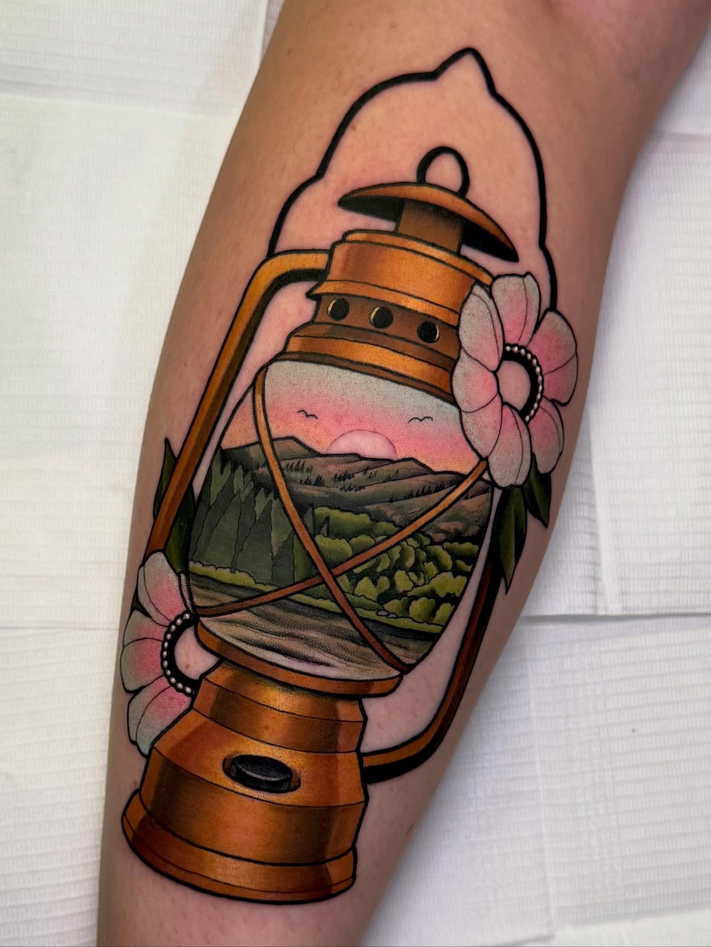 This creative sunrise tattoo places a vivid landscape inside a vintage lantern, blending natural beauty with nostalgic charm.