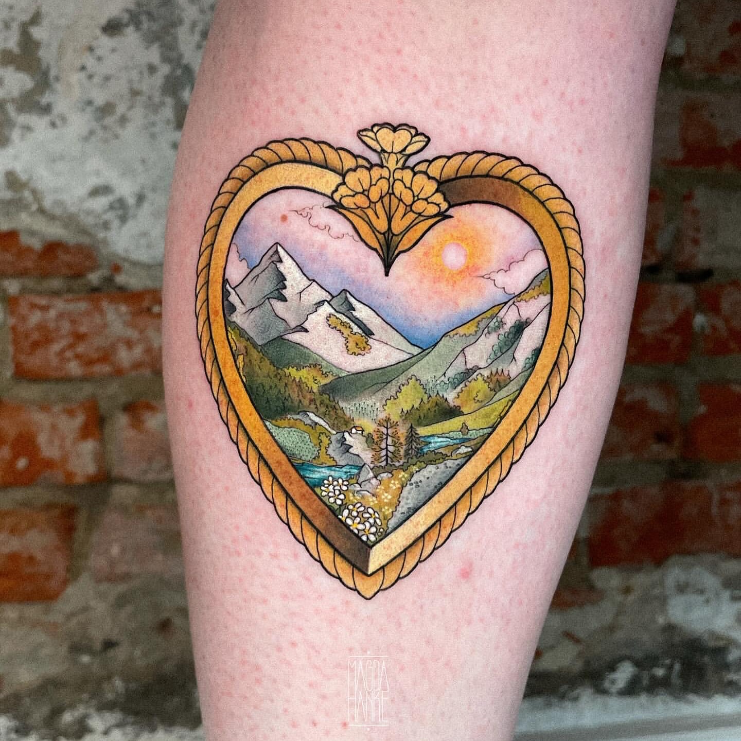 This beautifully detailed tattoo captures a peaceful sunrise framed within a golden heart-shaped border.