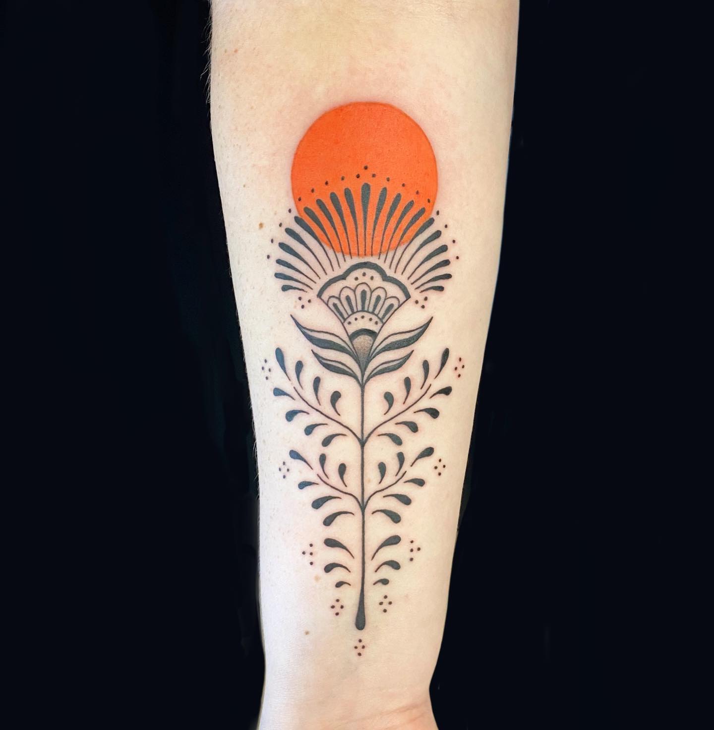 This elegant tattoo combines a bold orange sunrise with a stylized floral pattern that flows down the forearm.