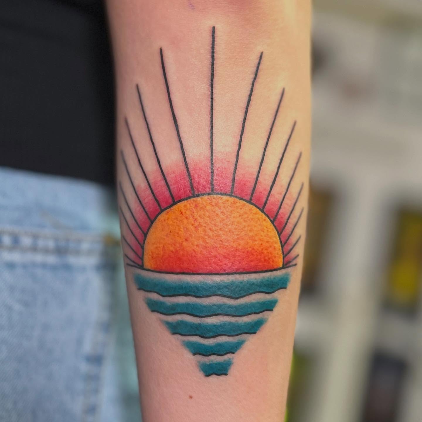 This colorful sunrise tattoo captures the warmth of morning light meeting calm ocean waves.