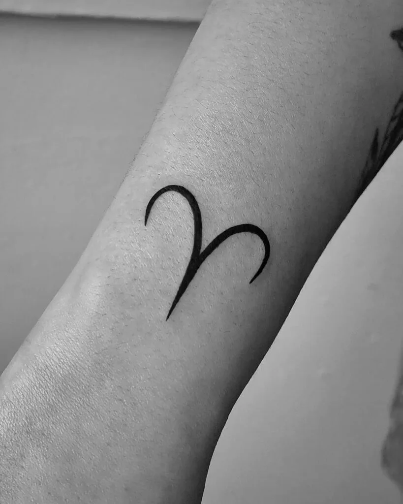 This minimalist tattoo features the Aries zodiac symbol, depicted with clean black lines that mimic a ram’s horns. Aries, the first sign of the zodiac, represents courage, passion, and leadership. The simple yet powerful design reflects the sign’s energetic and confident nature.