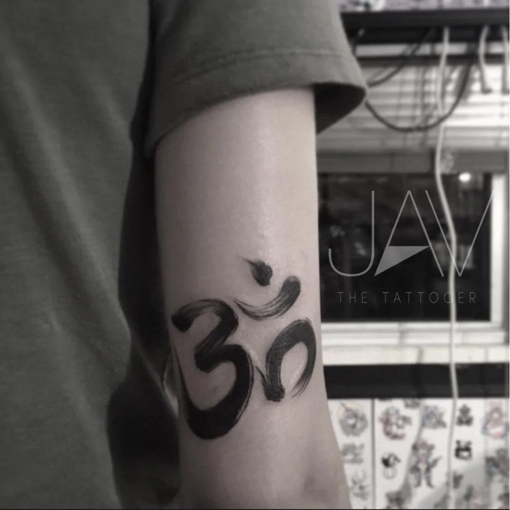 This powerful tattoo showcases the Sanskrit symbol “ॐ” (Om), executed in a bold brushstroke style on the back of the arm. The design gives a dynamic, painted-on effect, adding both motion and artistic flair to this deeply spiritual symbol.