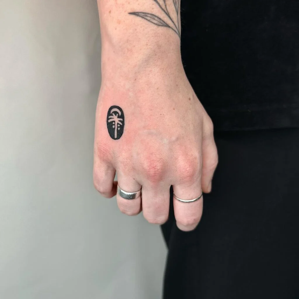 This small black tattoo on the hand features a palm tree within an oval-shaped background, creating a powerful contrast. The design evokes a minimalist island or tropical feel while also giving off a spiritual or tribal vibe due to its simplified form and symbolic balance.