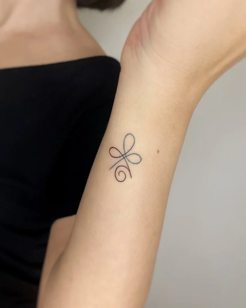 This elegant forearm tattoo features the Celtic strength symbol, a powerful emblem of resilience, courage, and inner fortitude. The design is formed from soft, continuous lines that loop into a symmetrical knot-like shape, representing the unbreakable spirit and unity of body, mind, and soul.