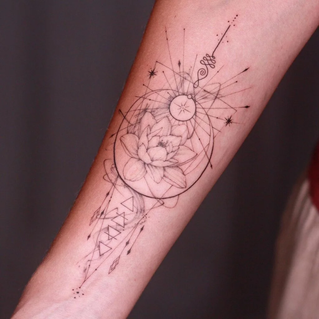 This stunning forearm tattoo merges celestial elements with the serene beauty of a blooming lotus. At the center is a delicately shaded lotus flower—symbolizing purity, enlightenment, and rebirth—encased in geometric circles that radiate with cosmic energy.