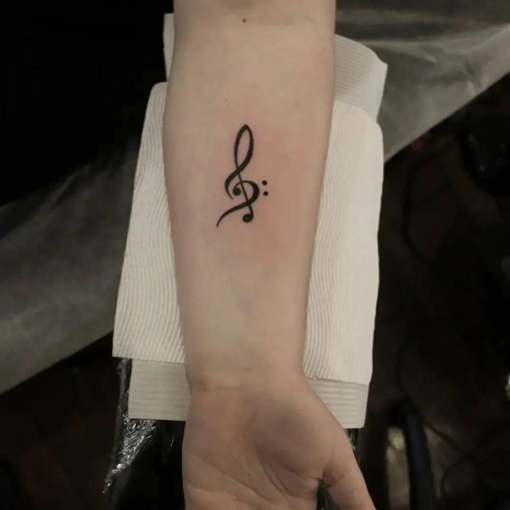 This bold forearm tattoo combines a treble clef with a bass clef colon, forming a unique and meaningful symbol for any music lover. The design reflects a passion for sound, melody, and rhythm, making it perfect for someone deeply connected to music creation or performance.