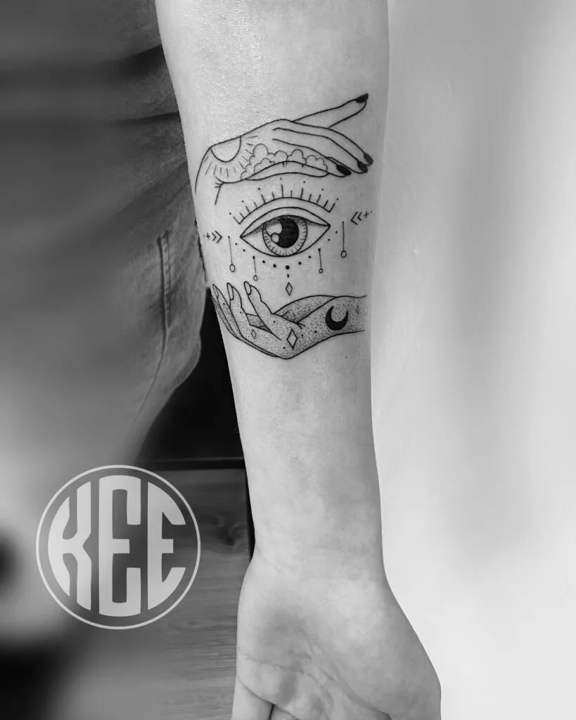 This mystical forearm tattoo features a central all-seeing eye delicately cradled by two ornamental hands. Intricate celestial details, including moons, stars, and sacred geometry, surround the eye, evoking a sense of protection and spiritual awareness.