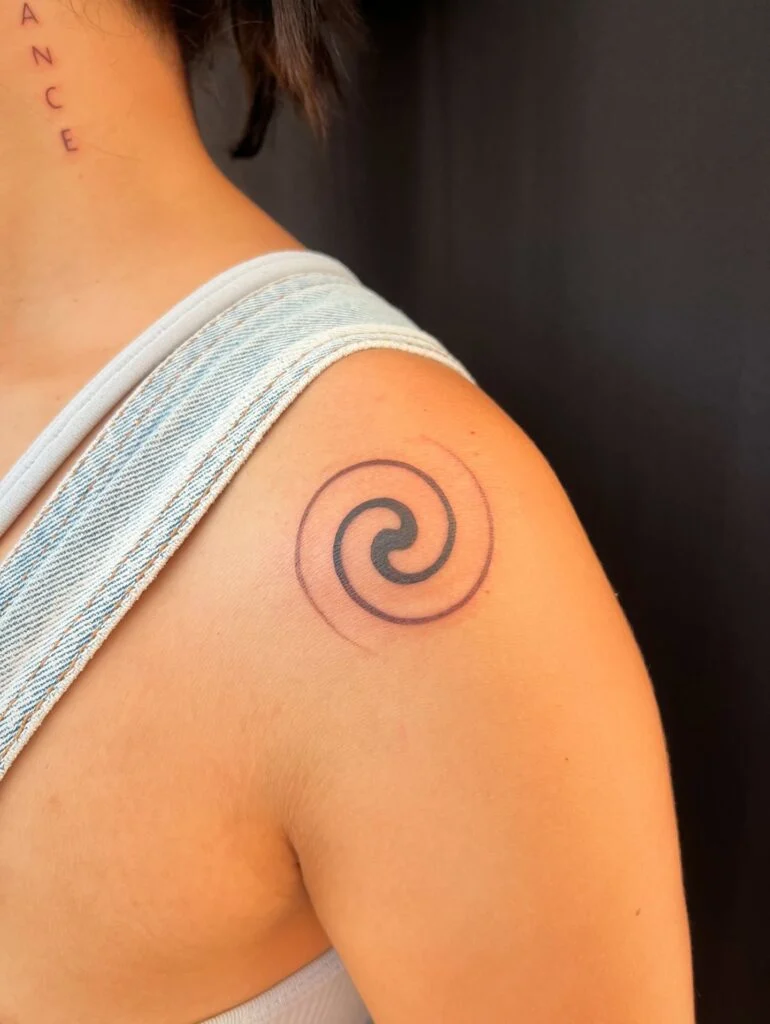 This shoulder tattoo features a bold double spiral, a symbol rich in spiritual and cultural meaning. The double spiral is often associated with cycles of life, balance between opposing forces, and continuous growth. Its motion suggests evolution, duality, and inner harmony.