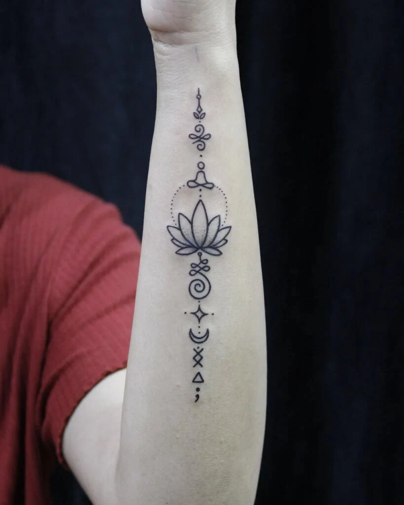 This elegant forearm tattoo combines several sacred symbols into one continuous vertical flow. At the top sits a meditative figure, symbolizing mindfulness and inner peace, followed by a blooming lotus representing spiritual awakening through struggle.