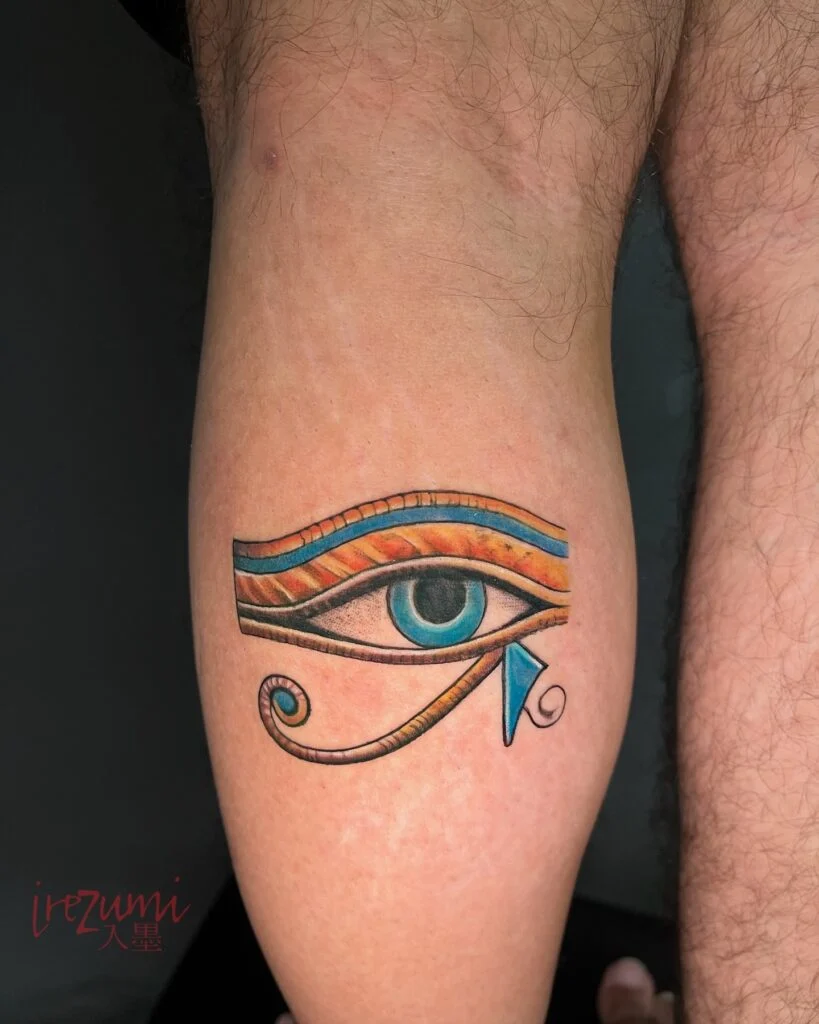 This vivid tattoo features the Eye of Horus, an ancient Egyptian symbol of protection, healing, and restoration. Inked on the calf, the design showcases bold colors—deep turquoise for the eye and warm amber, red, and gold tones for the surrounding markings.