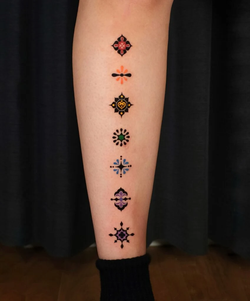 This vibrant leg tattoo features a vertical alignment of seven abstract geometric symbols, each rendered in bold black with striking pops of color.