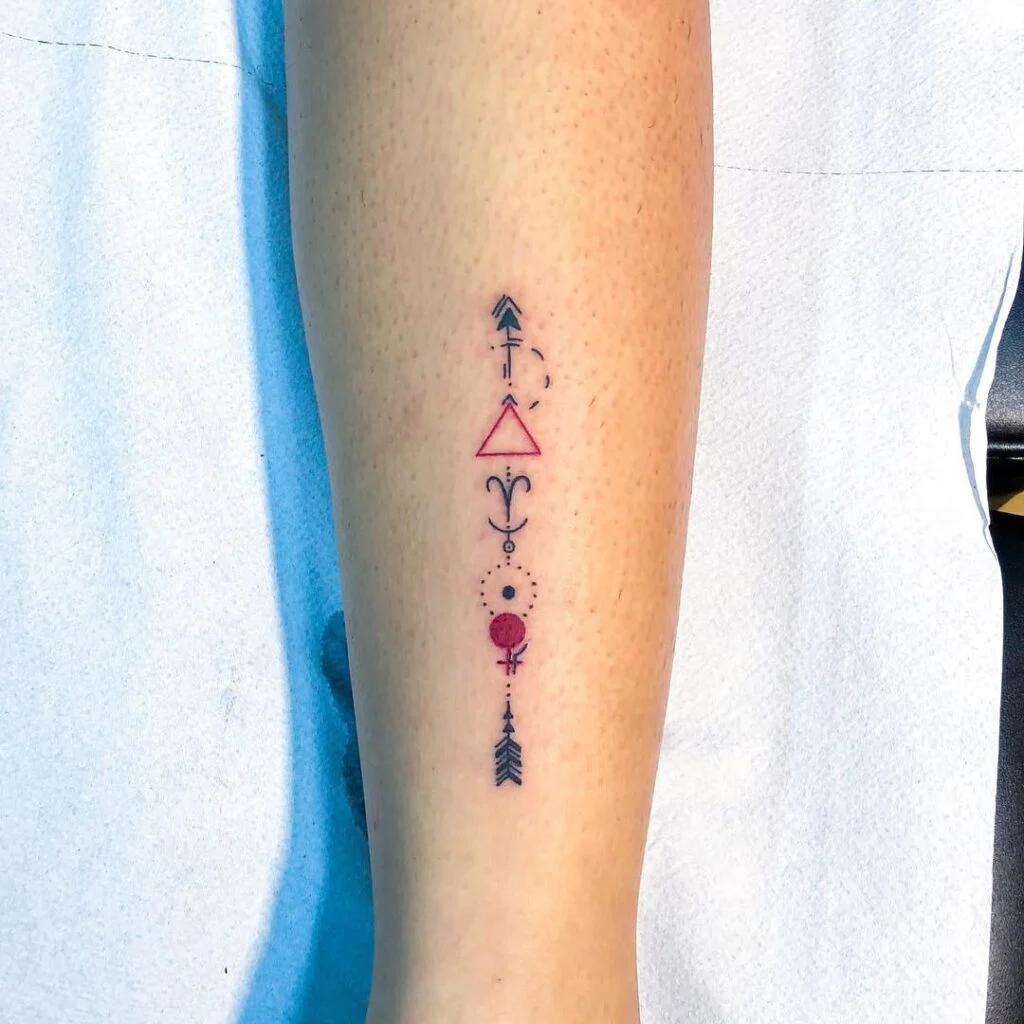 This striking tattoo combines geometric shapes, arrows, and symbolic elements into a balanced vertical composition. A red triangle pointing upward symbolizes fire and transformation, while the downward-pointing arrow mirrors direction and purpose.