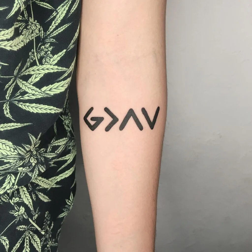 This forearm tattoo features a minimalist yet powerful Christian symbol: G>∧∨, which translates to “God is greater than the highs and lows.” Each shape represents a deeper meaning—‘G’ for God, ‘>’ for greater, ‘∧’ for highs, and ‘∨’ for lows.