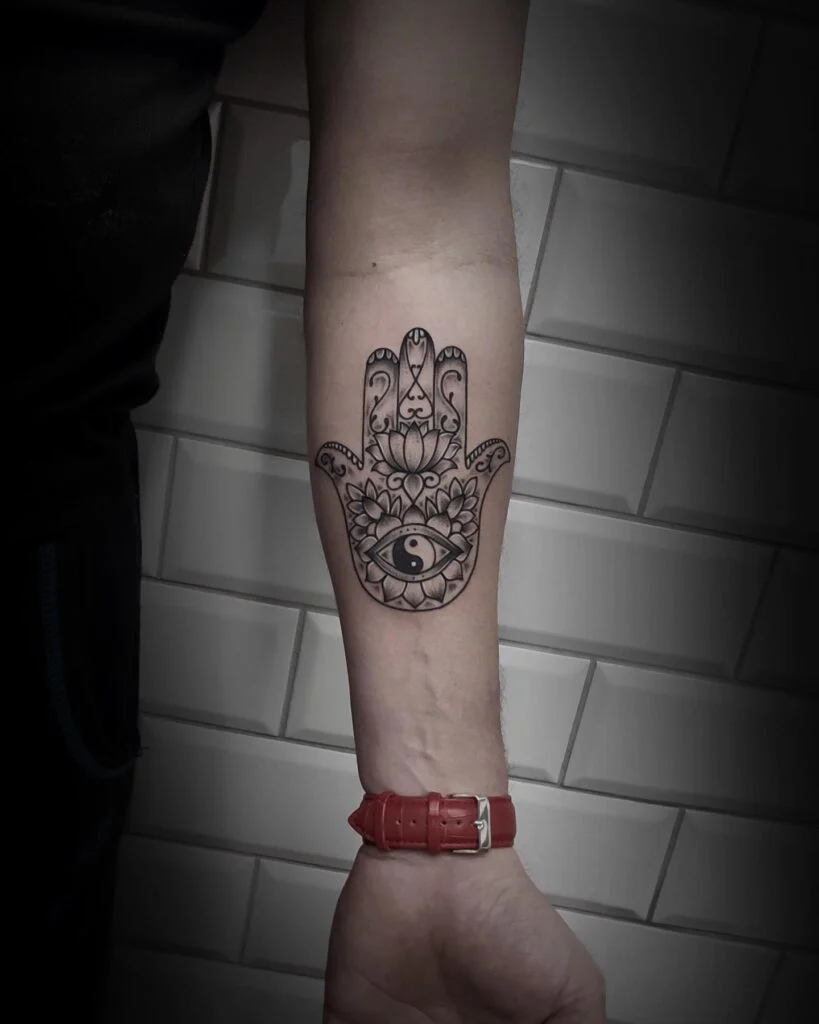 This powerful forearm tattoo features the Hamsa hand, an ancient protective symbol known to ward off evil and invite blessings. At its center is an eye, symbolizing intuition and protection from the “evil eye,” beautifully merged with a Yin-Yang symbol—representing harmony, balance, and duality.