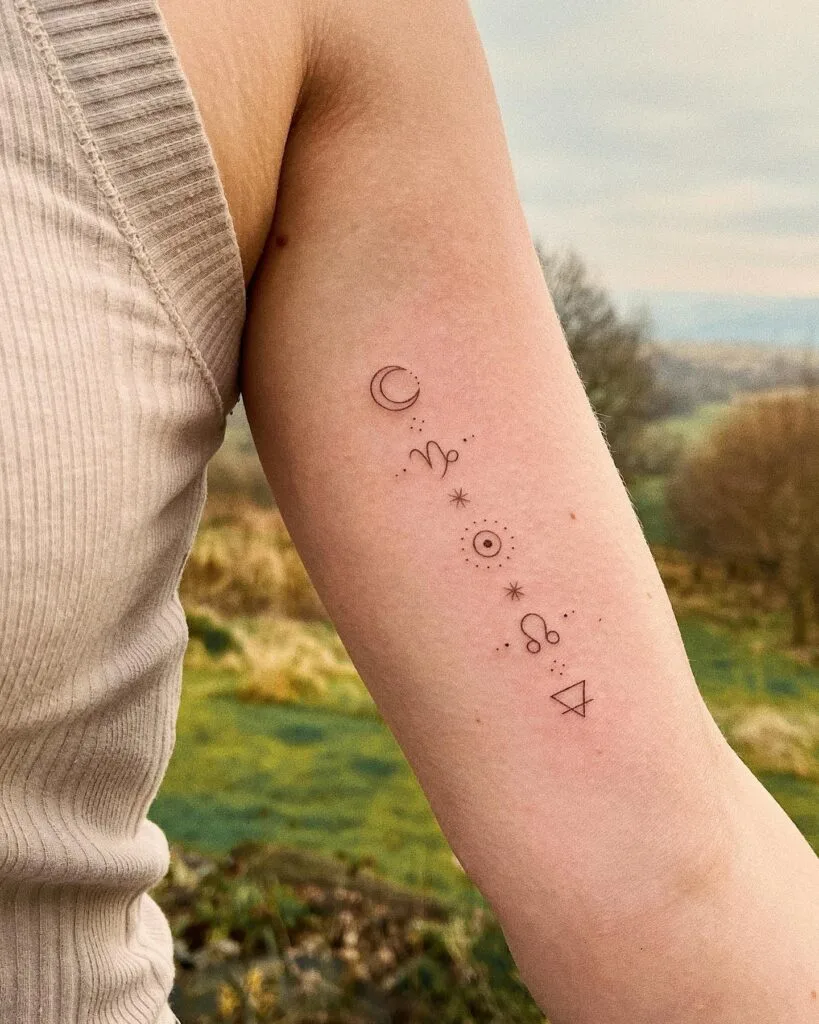 A small dot and star reflect presence of self—a quiet recognition of being. Next is the North Node, pointing to one’s life path and soul purpose. Finally, the Earth element symbol grounds the entire design, emphasizing stability and connection to nature. This tattoo is a subtle and intentional alignment of cosmic and personal guidance.
