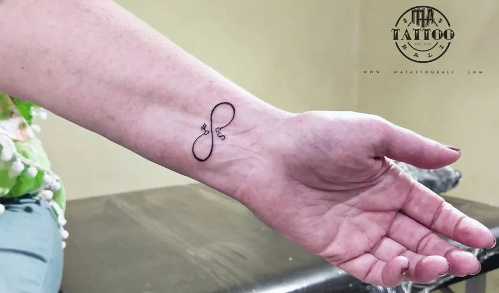Positioned on the inner wrist, it’s a subtle and meaningful expression of eternal love or an unbreakable bond—possibly between family members or loved ones. The use of fine lines keeps the look clean and minimalist, while the personalized elements make it deeply sentimental. It’s a timeless choice for someone wanting a permanent reminder of forever connections.