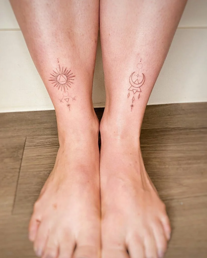 This delicate tattoo duo features the sun on one ankle and the moon on the other, each paired with sacred geometric shapes and fine ornamental details. The solar design glows with radiating lines and a central triangle, symbolizing energy, clarity, and vitality.