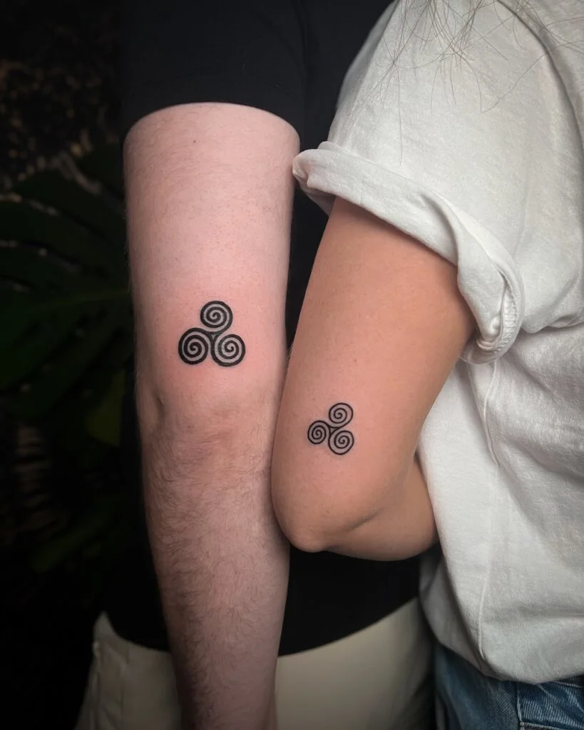 These matching tattoos feature the ancient triskelion—a Celtic symbol made of three spirals radiating from a central point. Found on the arms of two individuals, the design signifies unity, motion, and balance between the physical, mental, and spiritual realms.