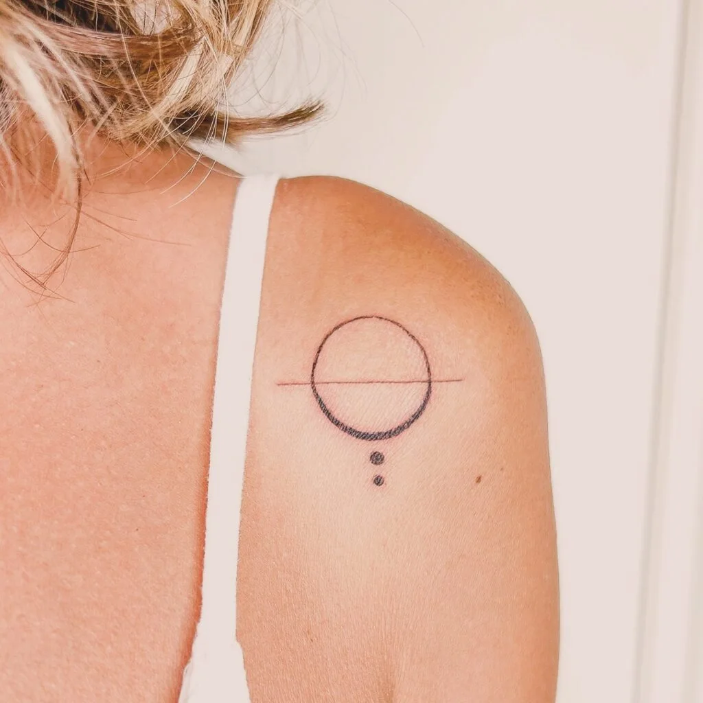 This minimalist shoulder tattoo captures the essence of balance through clean, geometric lines. A circle intersected by a horizontal line symbolizes harmony and equilibrium, while the shaded lower half and descending dots suggest groundedness and inner peace.