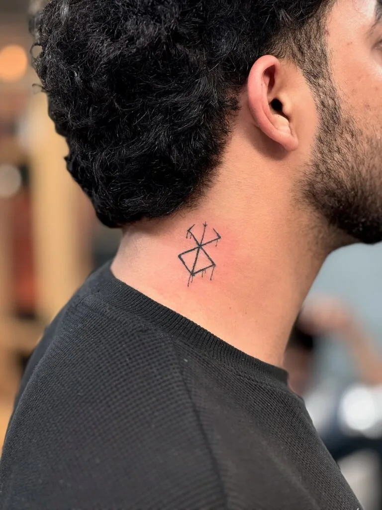 Bindrunes were traditionally used as powerful talismans, believed to amplify the energies of the runes they combine. Placed on the neck, a visible and vulnerable area, this design becomes a personal shield, signifying inner resilience and clarity of purpose. It’s a striking, minimalistic tattoo rooted in ancient symbolism and warrior spirit.