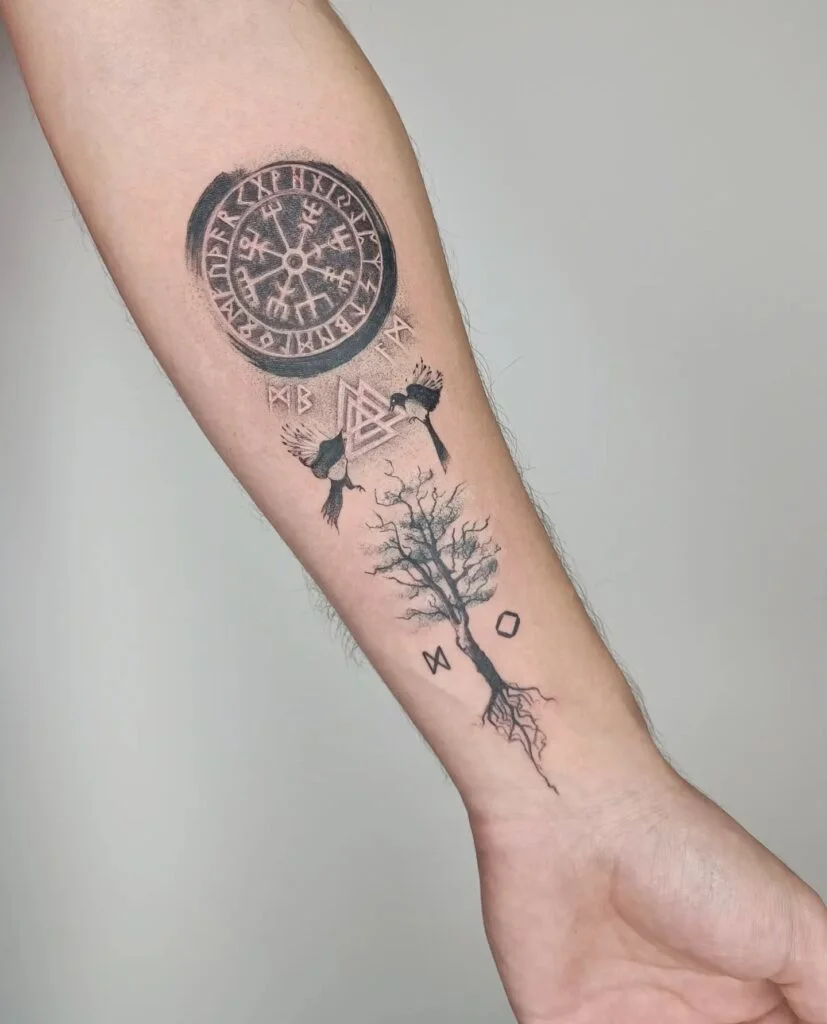 This striking forearm tattoo blends powerful Norse symbols into one cohesive design. At the top is the Vegvisir, or Norse compass, surrounded by runes—believed to guide and protect travelers. Beneath it lies the Valknut, a symbol associated with Odin and warriors destined for Valhalla.