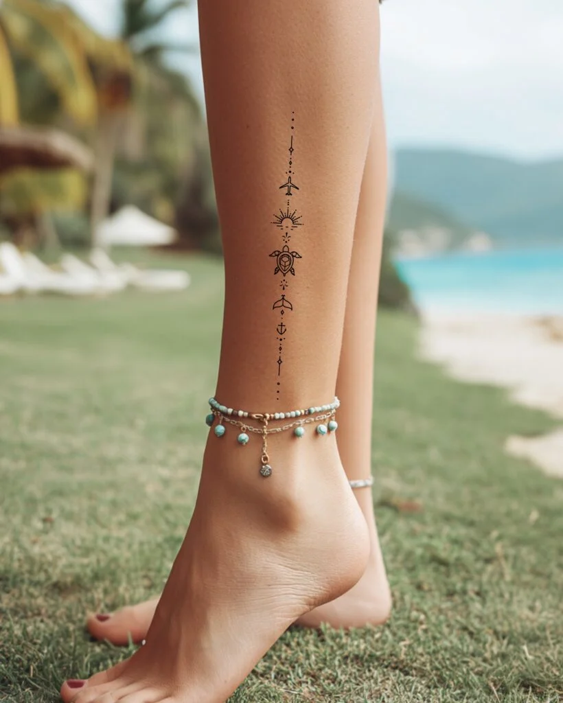 This vertical leg tattoo beautifully combines symbols of travel, nature, and the sea. At the top is an airplane, followed by a radiant sun, a sea turtle, waves, and finally an anchor. The turtle signifies longevity, peace, and a connection to the ocean.