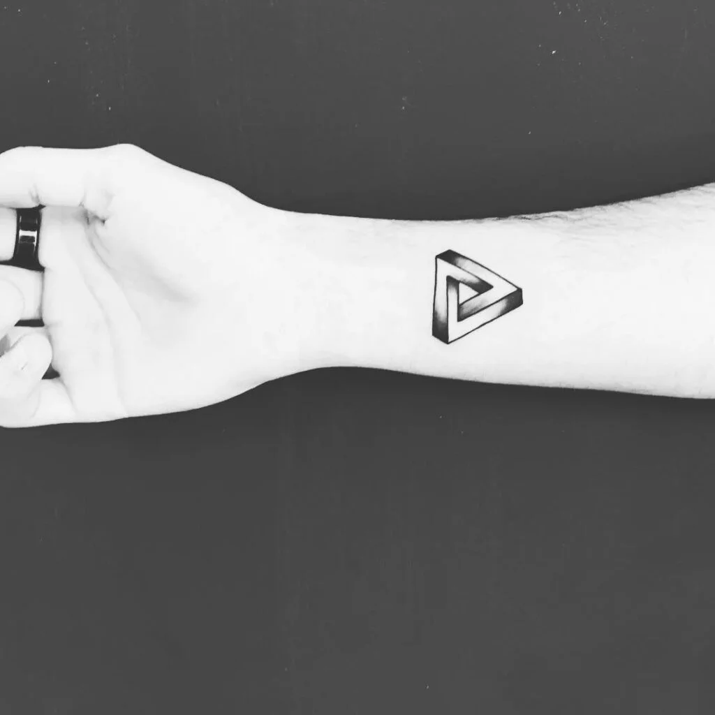 This forearm tattoo features a Penrose triangle, also known as the impossible triangle—a famous optical illusion that defies the laws of geometry. Its structure creates a loop that appears three-dimensional but cannot physically exist, symbolizing paradox, perspective, and the mind’s ability to perceive beyond logic.