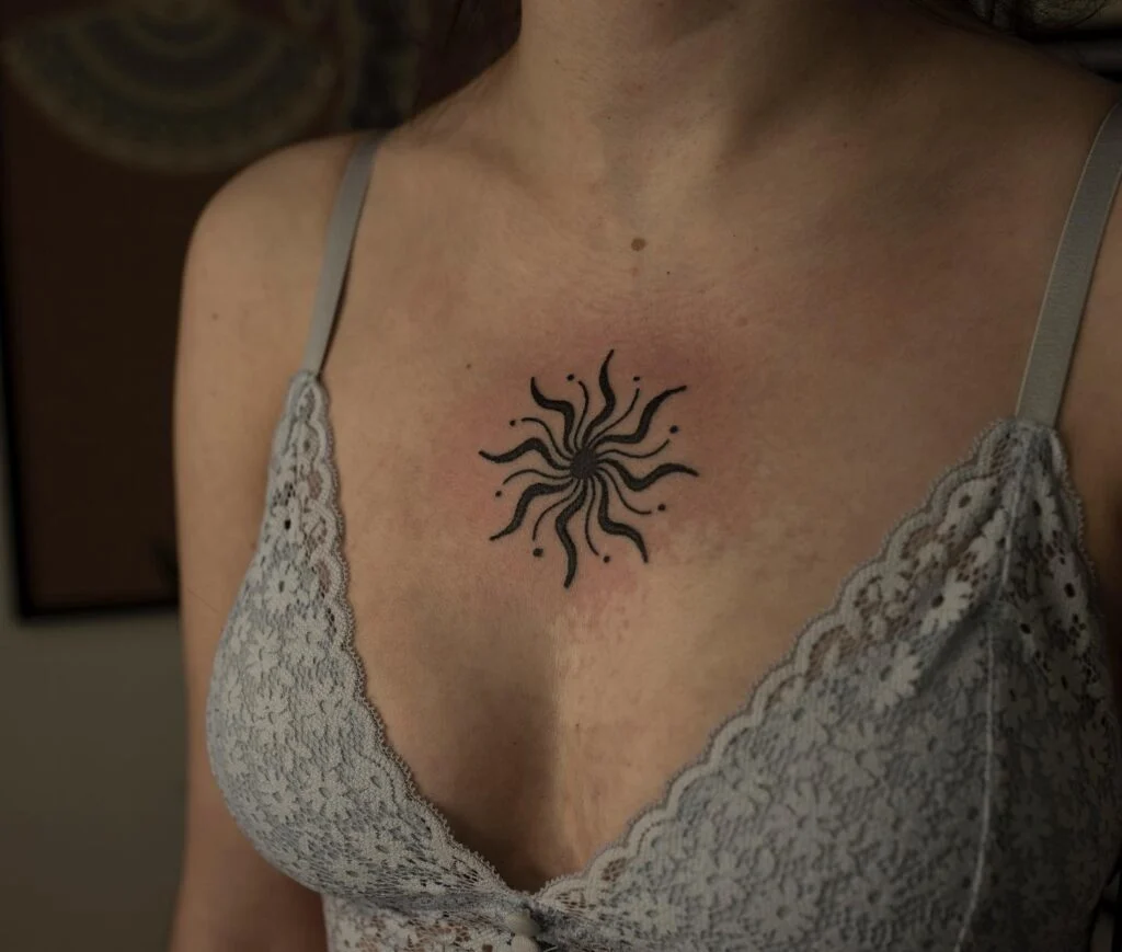This chest tattoo features a stylized sunburst with swirling rays and dotted accents radiating outward. The abstract design combines organic curves with dotwork elements, creating a sense of motion and energy. Positioned over the heart, the sun symbolizes warmth, life, inner strength, and clarity.