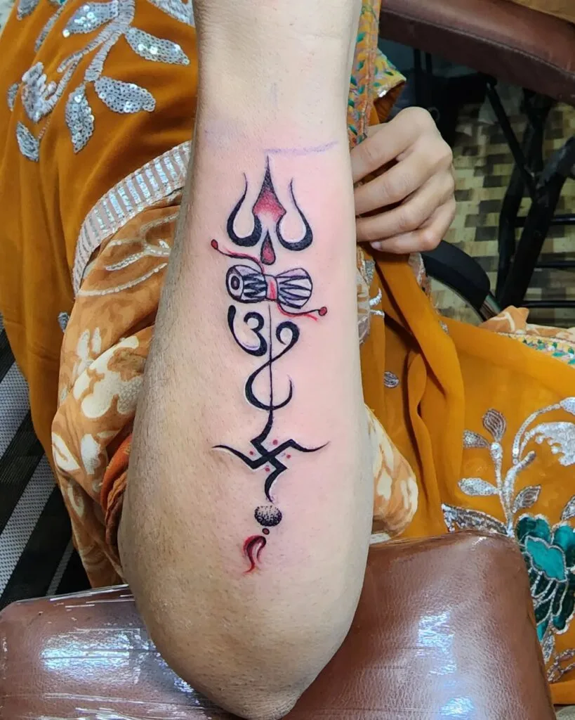 This powerful forearm tattoo weaves together key symbols of Lord Shiva and Hindu spirituality. At the top is the Trishul (trident), representing the three states of consciousness—waking, dreaming, and deep sleep. Below it sits the damaru, a small drum symbolizing cosmic sound and rhythm, often held by Shiva.