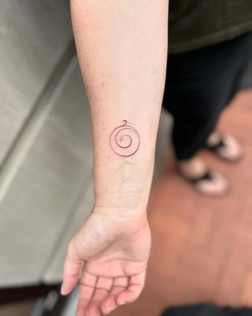 This minimalist wrist tattoo features a delicate spiral, symbolizing a personal journey of growth and gratitude. At its center rests a small, understated cross, representing faith and spiritual grounding.