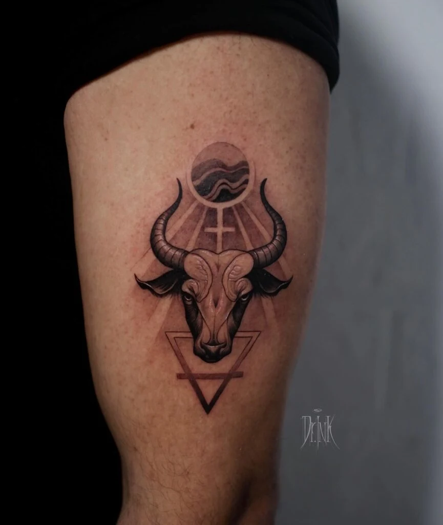 This bold thigh tattoo centers on a realistic bull’s head—symbolic of the Taurus zodiac sign—framed by powerful elemental and astrological symbols. The bull, known for its strength, determination, and grounded nature, rests above an inverted triangle with a horizontal line, representing the Earth element.
