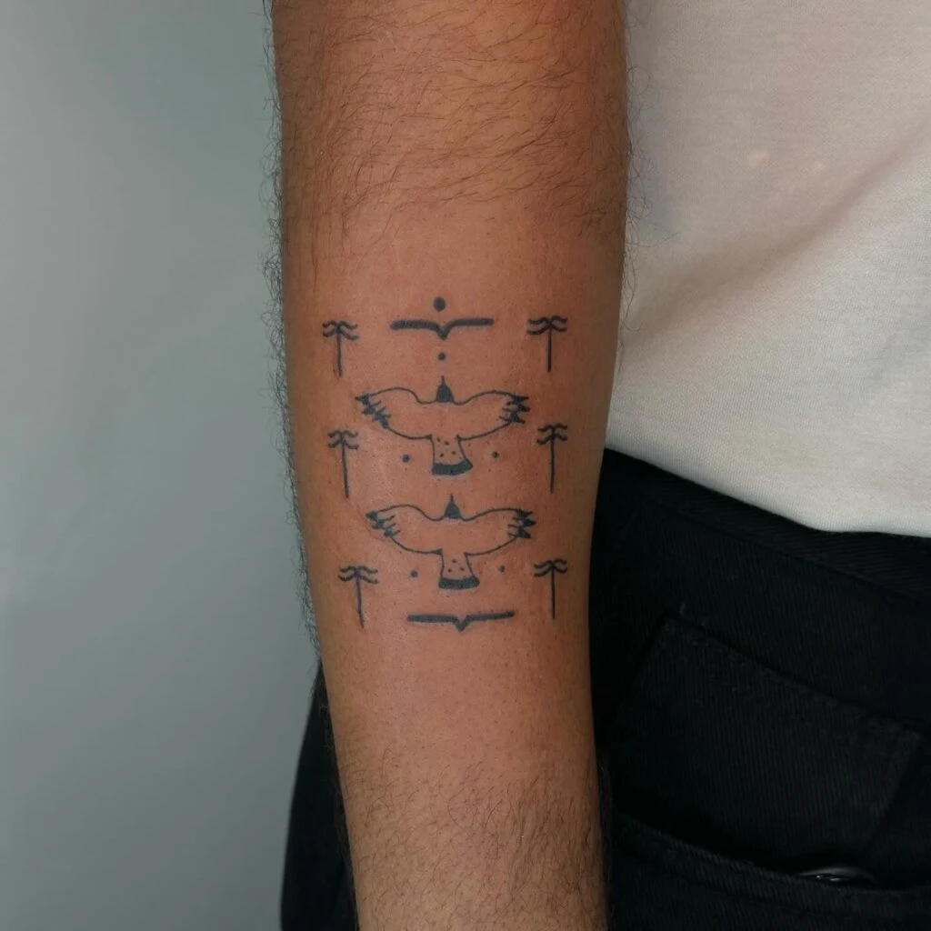 This striking forearm tattoo features mirrored thunderbird-like figures framed by abstract totems and symmetrical markings. Inspired by indigenous symbolism, the thunderbird represents power, protection, and a strong connection to the spiritual world.