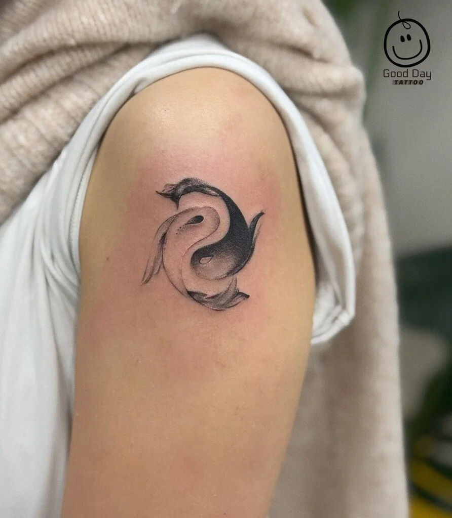 This graceful upper arm tattoo features two koi fish forming a flowing Yin-Yang shape, symbolizing harmony, balance, and duality. One fish is shaded in black and the other in light tones, representing opposing yet complementary energies—like darkness and light, strength and calm.