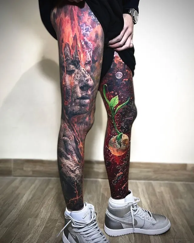 Full leg sleeves blend the thigh, calf, and shin, allowing an entire narrative or stylistic collection to unfold across the leg.
