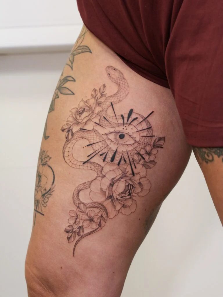 Many choose floral wraps, snakes, or ornamental patterns that curve naturally around the hip and thigh lines.