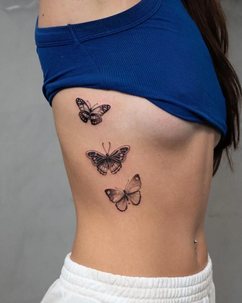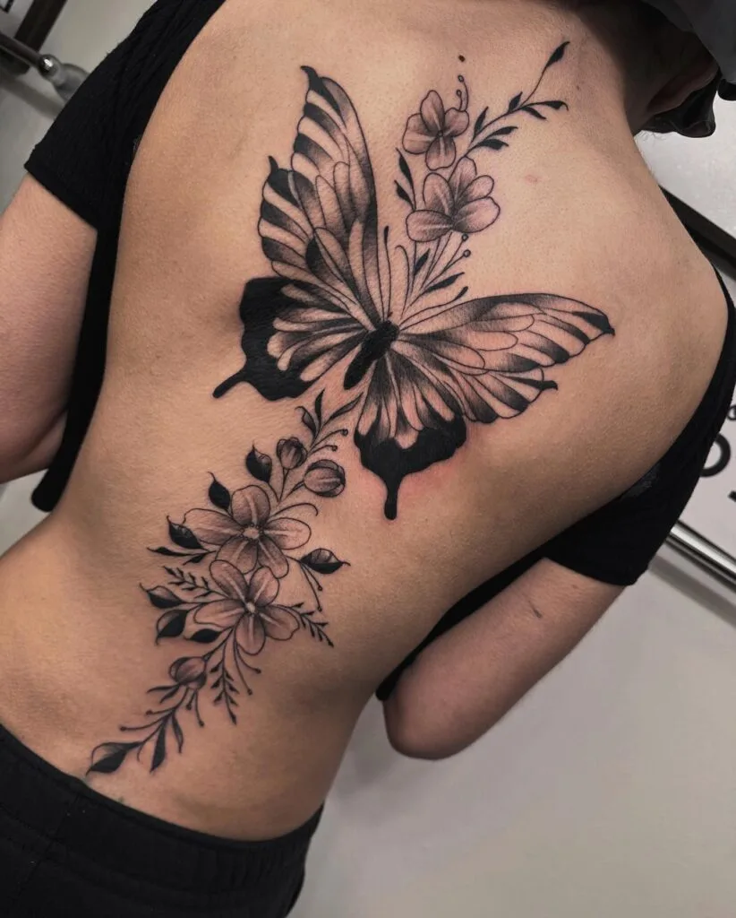 Rib tattoos are often chosen for their dramatic vertical flow, stretching with floral designs, lettering, or animal forms.