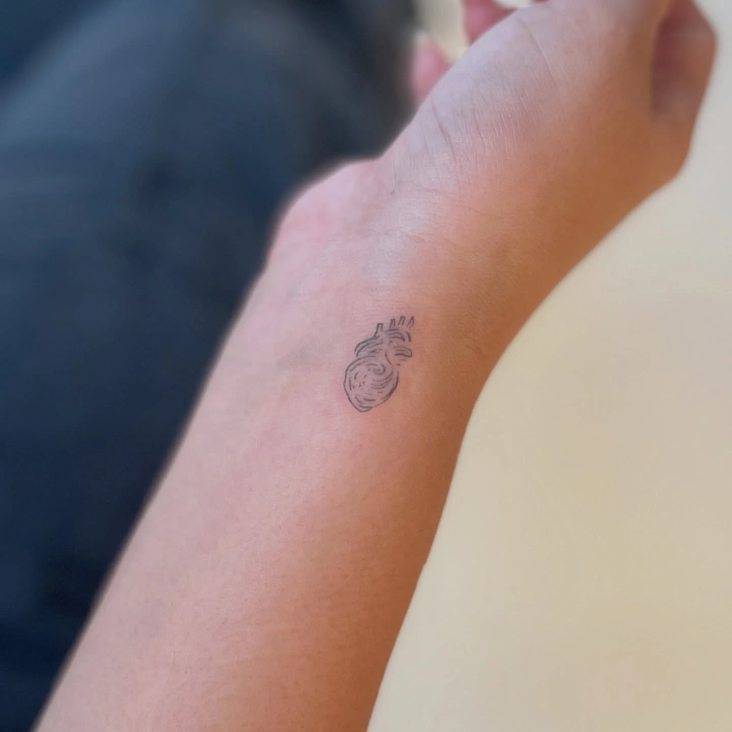 This tiny anatomical heart tattoo rests neatly on the wrist, blending medical detail with minimalist style.