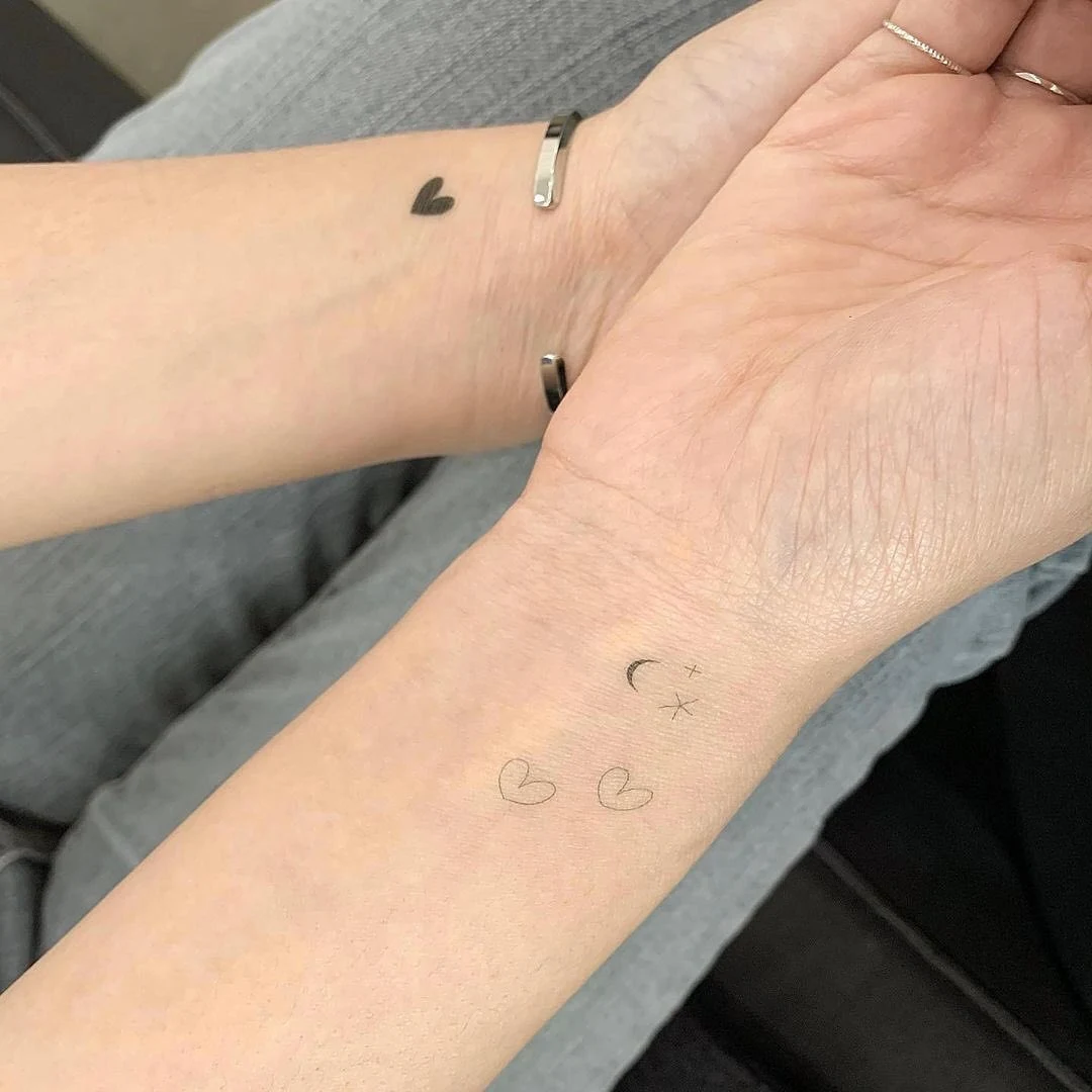 This tiny wrist tattoo set combines delicate celestial symbols with soft heart outlines for a light, dreamy look.
