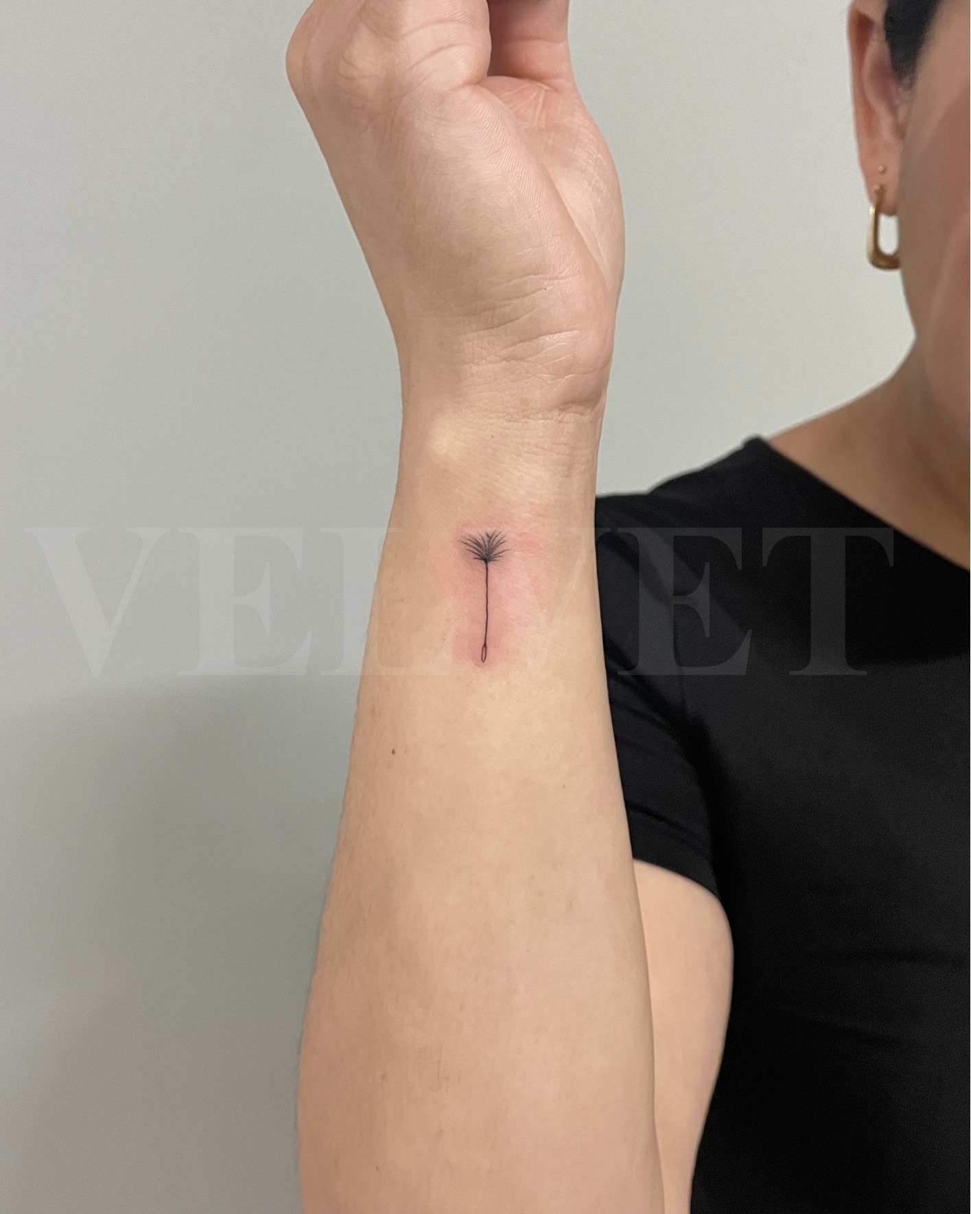 This tiny wrist tattoo shows a single dandelion seed with a fine stem and soft, airy filaments at the top.