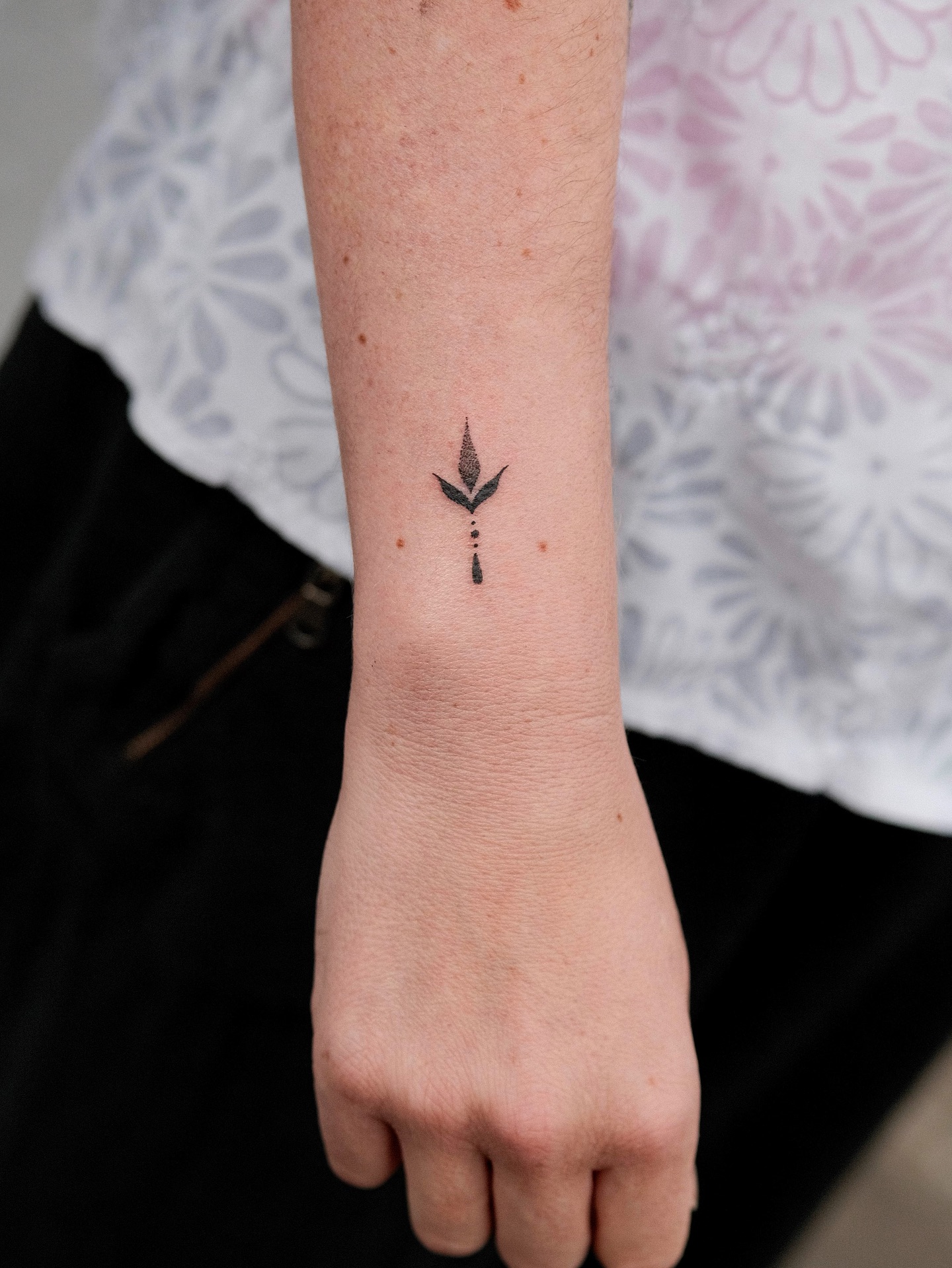 This tiny wrist tattoo features a vertically aligned geometric design that resembles a stylized arrow or symbolic plant form.
