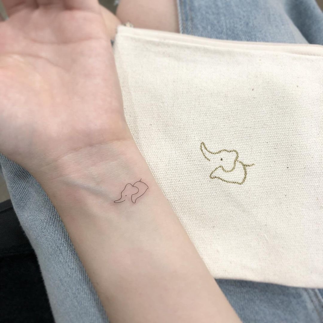 This tiny baby elephant tattoo sits gently on the wrist, drawn with a soft, continuous line that keeps the design light and minimal.