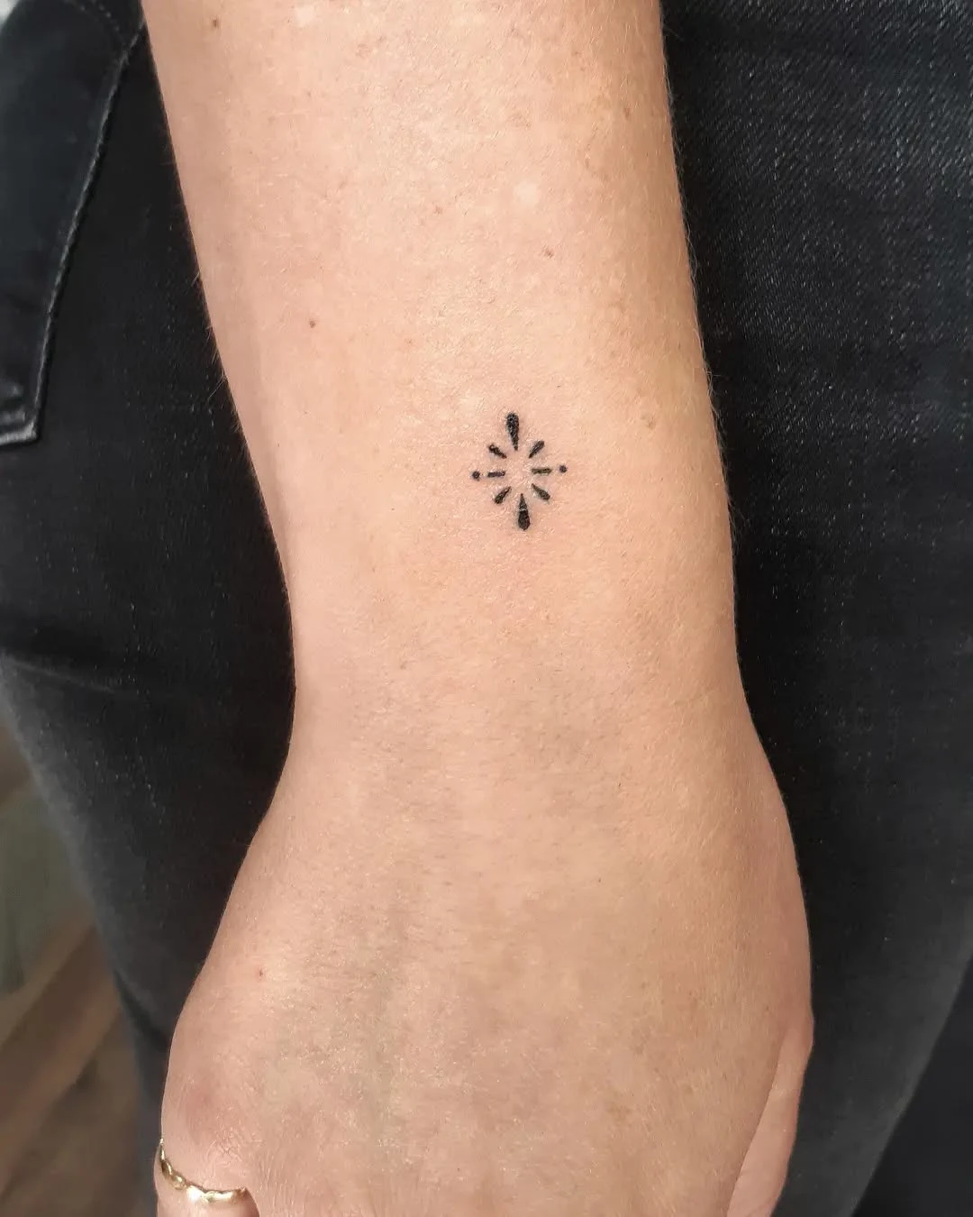 This tiny wrist tattoo features a small ornamental burst made from evenly spaced teardrop shaped marks arranged in a circular pattern.