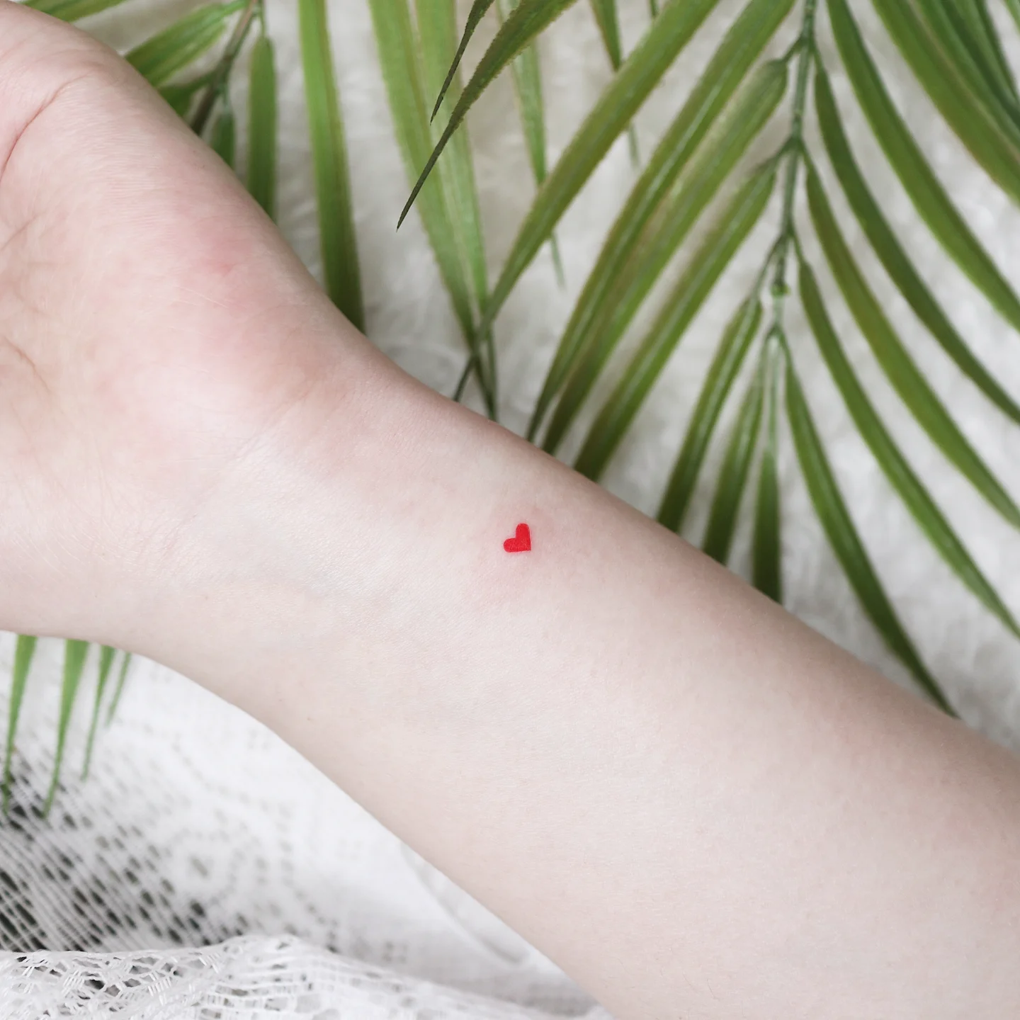 This tiny red heart tattoo sits softly on the wrist, adding a gentle pop of color to a simple, minimal design.