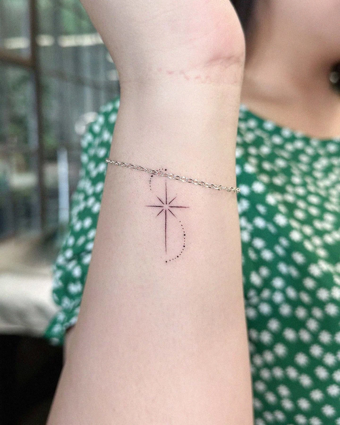 This subtle wrist tattoo features a small radiant star paired with a delicate curve of moon phases, arranged in a gentle arc.