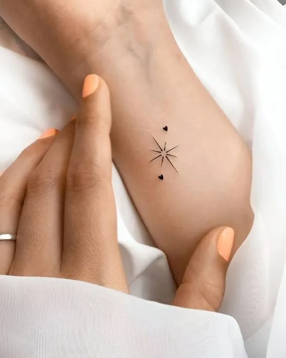 This tiny wrist tattoo combines a delicate starburst with two miniature hearts, creating a sweet and balanced design.