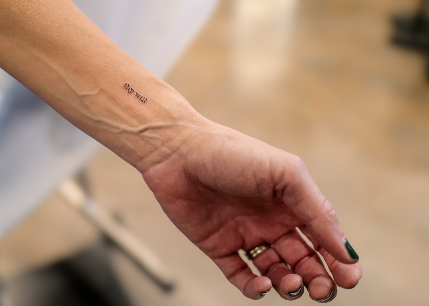 Tiny “Thy Will” Script Wrist Tattoo