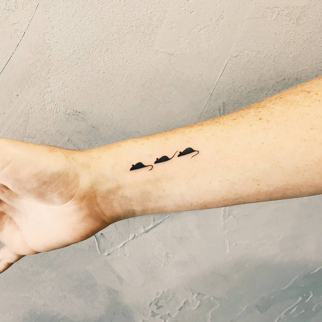 This tiny wrist tattoo features three small mice in a neat row, each rendered in simple black silhouettes.