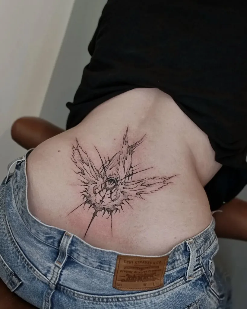 Positioned on the lower back, it adds a daring yet refined edge to body art. This tattoo beautifully blends toughness and elegance, giving it strong appeal for those seeking impactful ink.