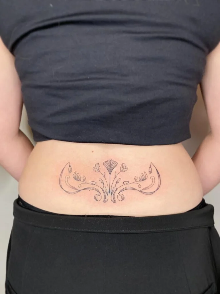Delicate Floral Linework Lower Back Tattoo