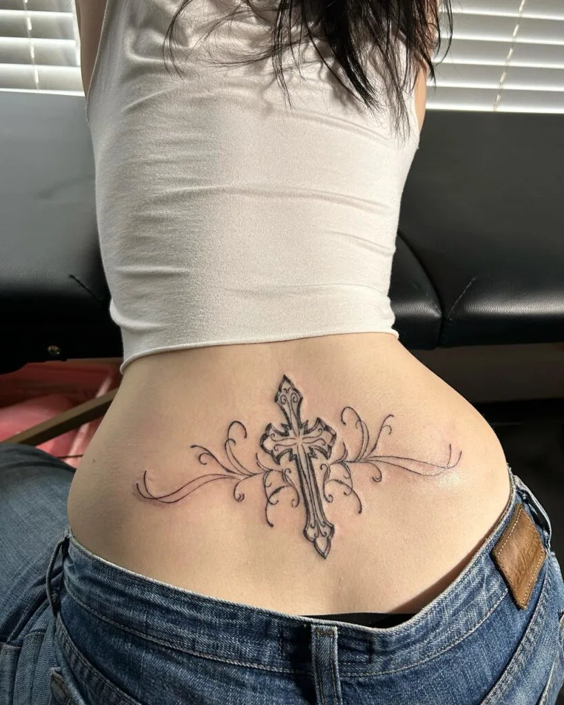 This lower back tattoo features a beautifully detailed cross surrounded by swirling ornamental accents, creating a powerful yet elegant design.